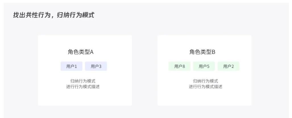 再将不同的角色间同类行为模式归纳(合并同类项),进行行为描述。此处需注意以行为变量为依据进行用户对应时,不必追求绝对的精准,只要相对能映射清楚即可。