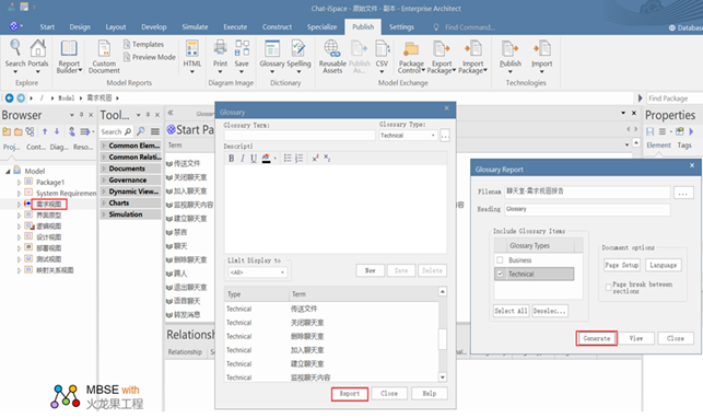 在 ea 中可以将项目词汇表生成模型词汇表的 pdf 文件报告,这个 pdf 文件报告可以包含所有词汇表条目,也可以仅包含选定类型的词汇表条目。
