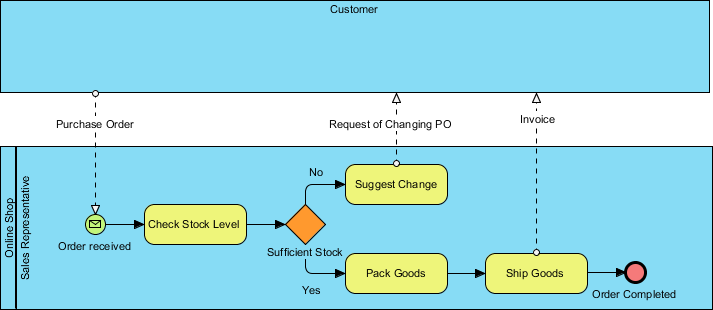 我们将要演示的示例是关于销售商品的在线商店的当前状况(即流程)。该过程开始于销售代表从客户那里收到采购订单,然后继续检查库存水平。如果手头有足够的库存来应付订单,销售代表会把它们打包。这一过程结束时将它们与发票一起运输。如果库存不足,销售代表将建议客户修改采购订单。